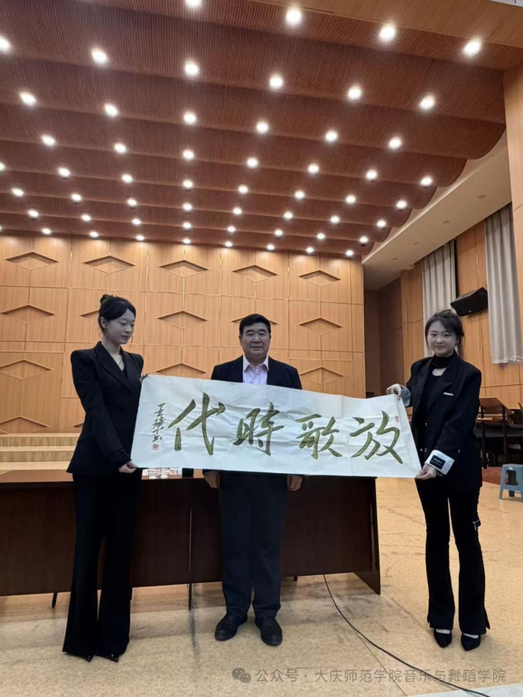讲座尾声,王璟向音乐与舞蹈学院赠送了自己亲手书写的书法作品“放歌时代”。这幅作品不仅展现了王璟在书法领域的造诣,更寄托了他对师生们的殷切期望。