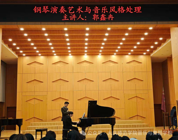 讲座以《钢琴演奏艺术与音乐风格处理》为题,在庄重而浓厚的学术氛围中拉开帷幕。首先,大三学生常广利登台献艺,演奏李斯特音乐会练习曲《叹息》。郭鑫冉先生对其演奏进行了细腻入微的点评与全面剖析,重点阐释了旋律线条与伴奏声部的平衡之道,引导学生通过宏观把握音乐行进方向,在技巧艰深的演奏中,勾勒出如诗般起伏的层次,传递出饱满的情感张力。