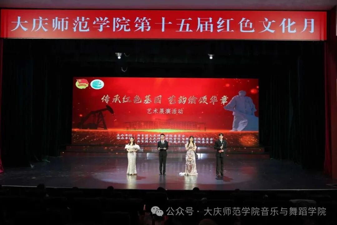 为进一步深入学习贯彻习近平新时代中国特色社会主义思想,落实党的二十大和二十届二中、三中、四中全会精神,丰富校园文化生活,引导广大团员青年坚定理想信念,传承红色基因,涵养家国情怀,深化大庆精神(铁人精神)育人实践。2025年11月24日晚,由校团委主办,音乐与舞蹈学院团委、美术与设计学院团委共同承办的大庆师范学院第十五届红色文化月“传承红色基因,艺韵绘颂华章”艺术展演在大学生活动中心成功举行。